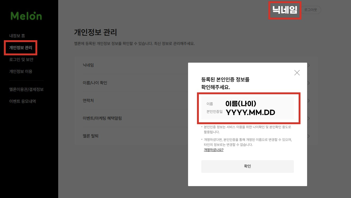 - 멜론 개인정보 페이지의 본인 성명이 카카오 계정 연동으로 인해 보이지 않는 경우 구매 내역서와 개인정보 페이지 상단에 닉네임 또는 카카오 계정이 동일해야 하며, 개인정보 페이지 + 본인인증(이름 + 생년월일) 화면이 같이 보이게 출력해 주시기 바랍니다.