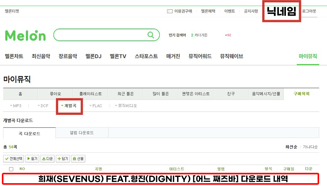 ※ 음원 구매 내역서 예시 (멜론 로그인 → 마이뮤직 → 구매목록 → 개별곡 클릭)